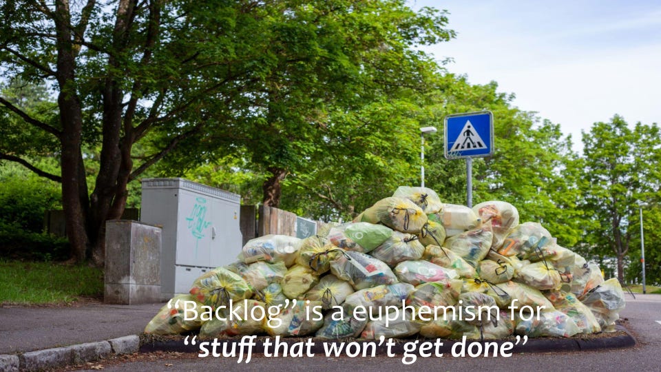 It keeps your backlog clean, and it helps you to start training your stakeholders that requests are feedback, not an immediate promise from you that you’ll deliver something. Because we all know that the likelihood of you being able to even come close to delivering on every request is slim to none.